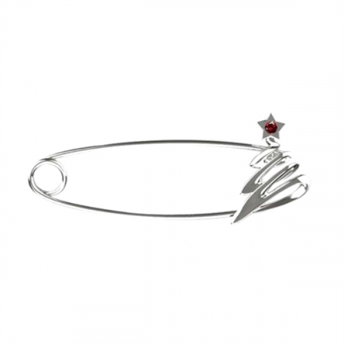 Изящная брошь в виде булавки с фантазийным дизайном, украшенным фианитом красного цвета, выполнена из серебра 925 пробы