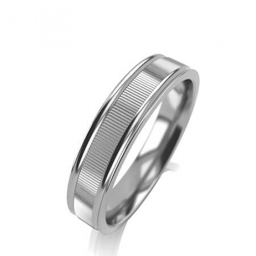 Стильное обручальное кольцо с рельефным рисунком выполнено из белого золота 585 пробы.