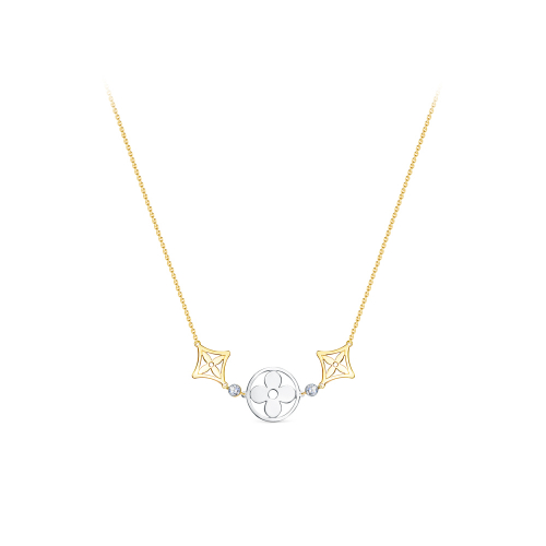 Стильное цепочное колье на основе "якорного" плетения с декоративной подвесной частью, выполнено в сочетании желтого и белого золота 585 пробы