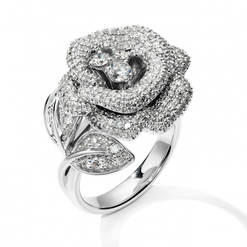 Роскошное кольцо в виде розы, инкрустированной сверкающими бриллиантами, выполнено из белого золота 585 пробы