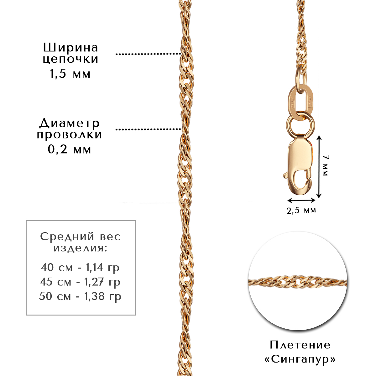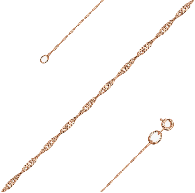 Нежная женская цепь из красного золота 585 пробы в редком плетении «Сингапур» с очаровательной алмазной гранью притягивает взор изящностью и игривым блеском