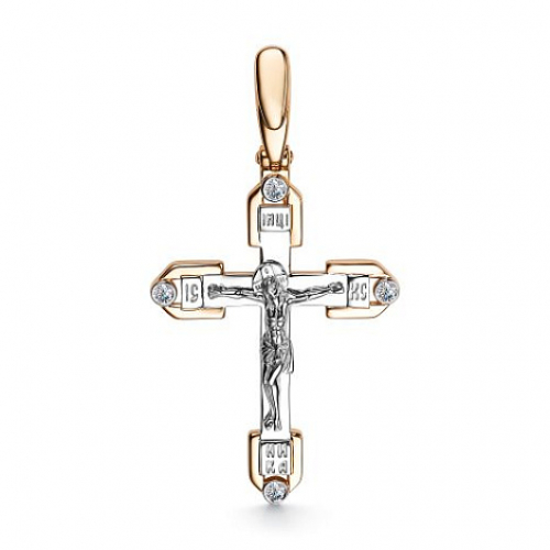 Подвеска в виде нательного креста прямой формы выполнена из комбинированного золота 585 пробы, украшенная сияющими бриллиантами