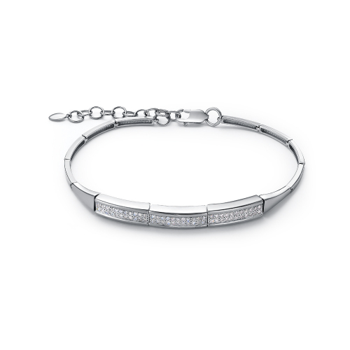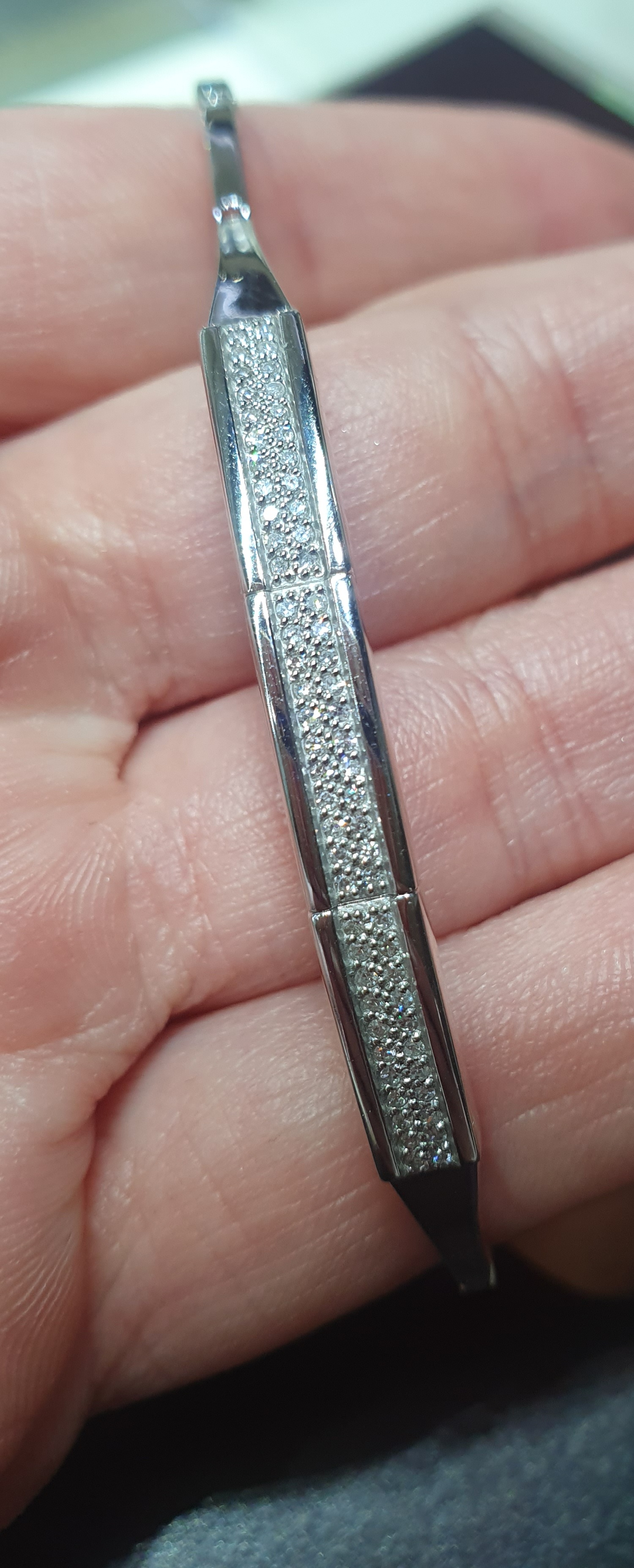Элегантный жёсткий браслет, украшенный в центре ажурной прямоугольной вставкой, инкрустированной бриллиантами, выполнен из белого золота 585 пробы
