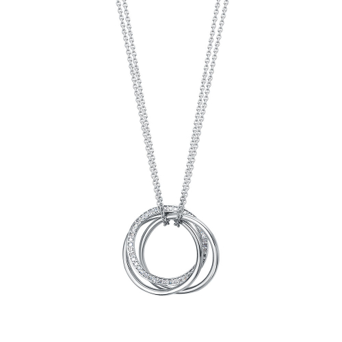 Стильное колье с двойной цепочкой, украшенное изящными подвесками - колечками, одно из которых инкрустированно бриллиантами, выполнено из белого золота 585 пробы