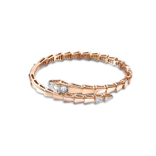 Стильный браслет в виде змеи, выполнен из красного золота 585 пробы, украшен сияющими фианитами