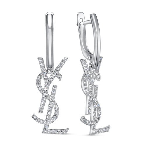 Стильные удлинённые серьги с подвеской в виде логотипа Yves Saint Laurent, выполнены из серебра 925 пробы, украшены фианитами