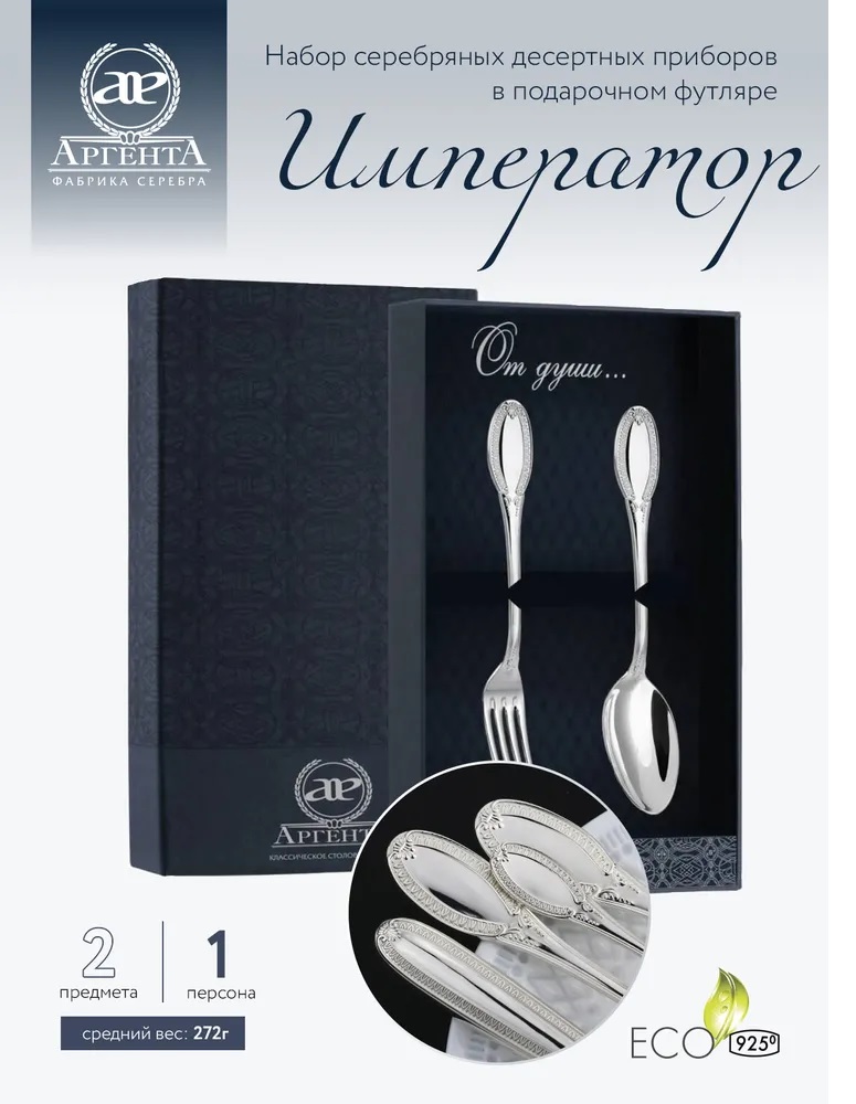 Ложка и вилка - десертные из набора "Император" изготовлены из серебра 925 пробы без примесей посторонних металлов и без применения гальванического покрытия