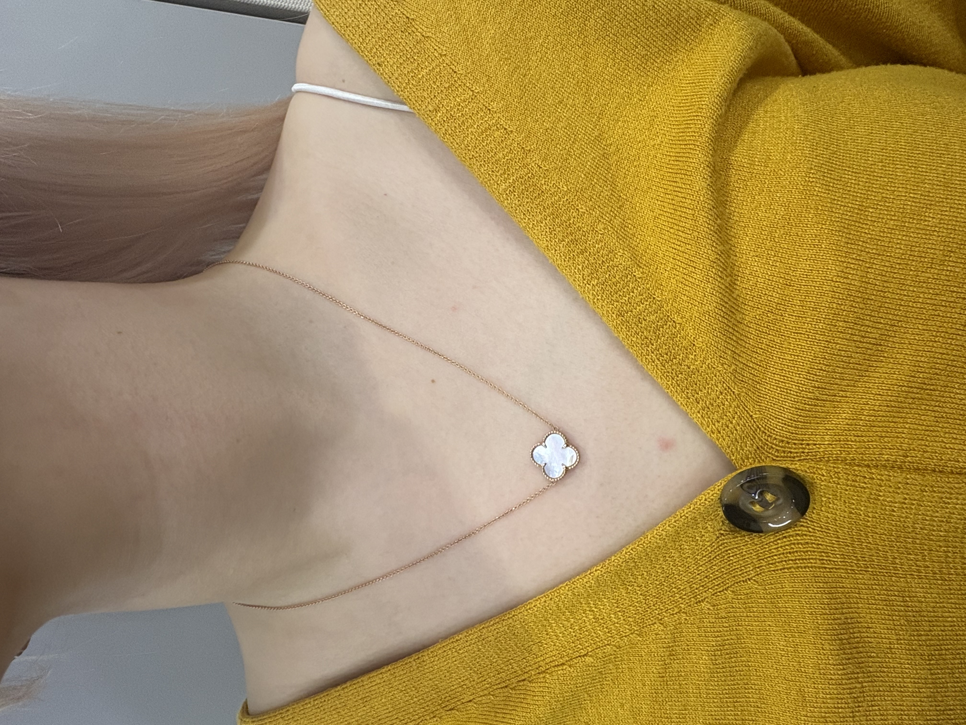 Нежное цепочное колье с подвеской в виде цветка, украшенного перламутром, выполнено из красного золота 585 пробы