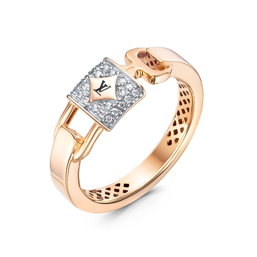 Кольцо, украшенное в центре вставкой с фианитами и логотипом французского дома моды "Louis Vuitton", выполнено из красного и белого золота 585 пробы