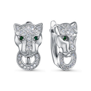 Серьги в виде пантеры, украшенной бесцветными и зелёными фианитами, выполнены из серебра 925 пробы