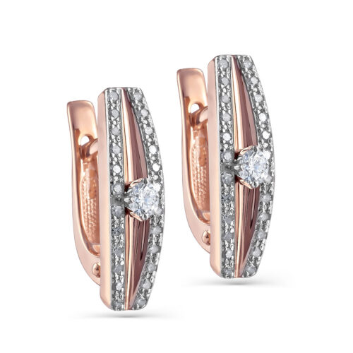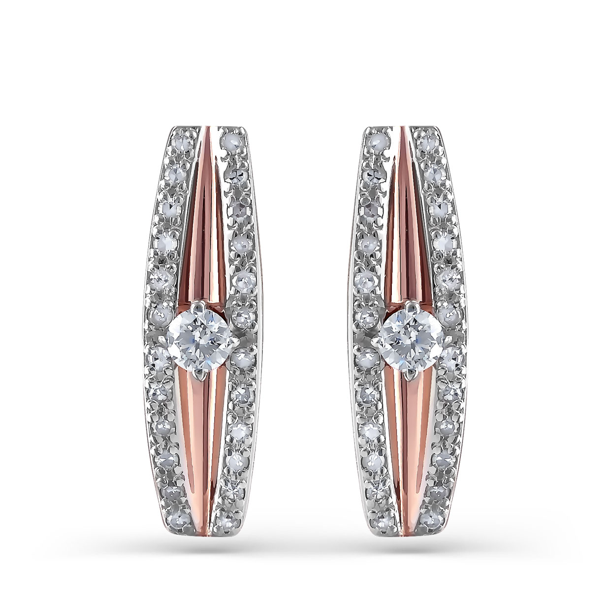 Роскошные серьги с бриллиантом в центре, красоту и блеск которого подчёркивает двойная дорожка бриллиантов меньшего размера, выполнены с сочетанием красного и белого золота 585 пробы