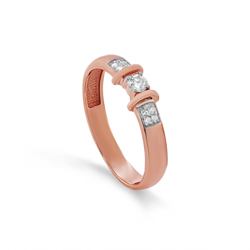 Кольцо с бриллиантом, в окружении сверкающих бриллиантов меньшего размера, выполнено с сочетанием красного и белого золота 585 пробы