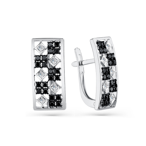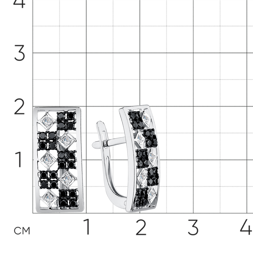 Нежные ажурные серьги, украшенные чёрными и бесцветными сверкающими бриллиантами, выполнены из белого золота 585 пробы
