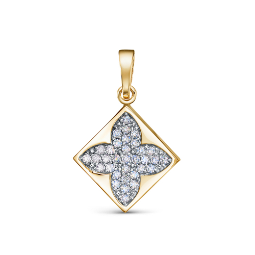 Современная и стильная подвеска выполнена в европейском дизайне в виде четырехлистника из жёлтого и белого золота 585 пробы, украшена россыпью сияющих фианитов
