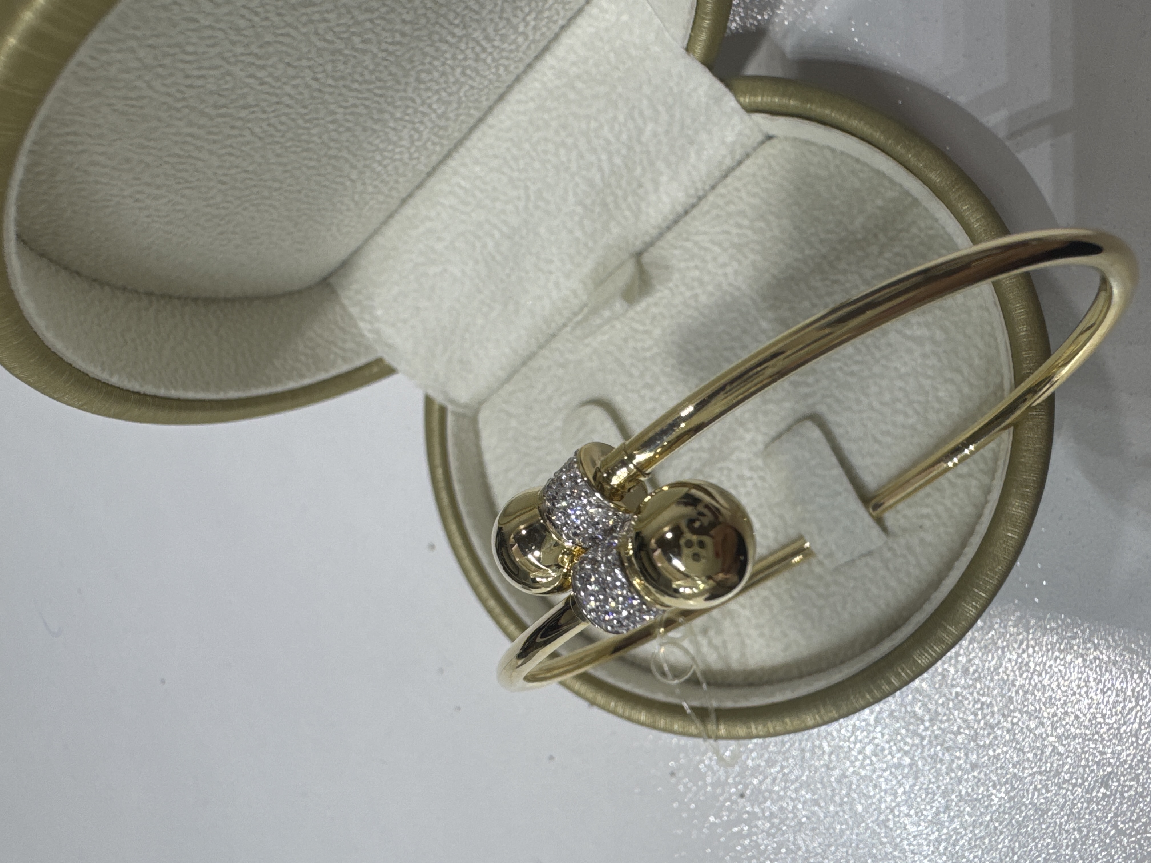 Жёсткий браслет с стильным лаконичным дизайном, который подчёркивают искры фианитов, выполнен из жёлтого и белого золота 585 пробы
