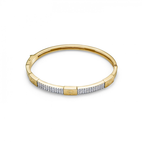 Жёсткий браслет, украшенный дорожками сверкающих фианитов, выполнен из жёлтого и белого золота 585 пробы