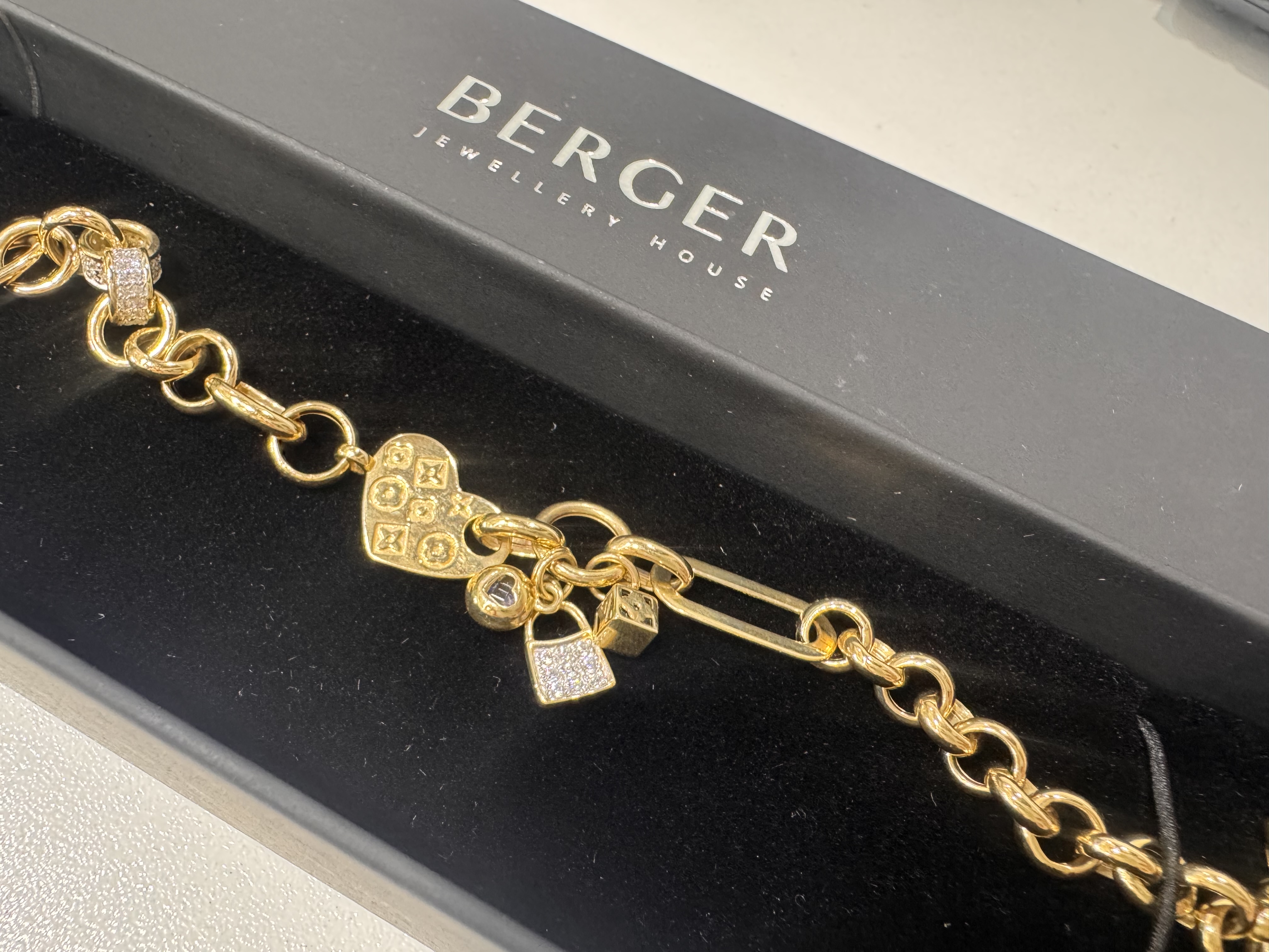 Браслет выполнен в виде шармов, которые выполнены в разных стилях и дизайнах. Шармы представлять собой миниатюрные символы, геометрические формы, замочек и сердечко . Каждый шарм добавляет браслету индивидуальности и характера. Покупал на подарок , думаю девушка оценит подарок по достоинству.