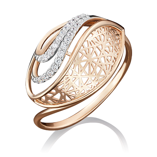 Кольцо с изящным ажурным дизайном, красоту которого подчёркивают дорожки фианитов, выполнено из красного и белого золота 585 пробы