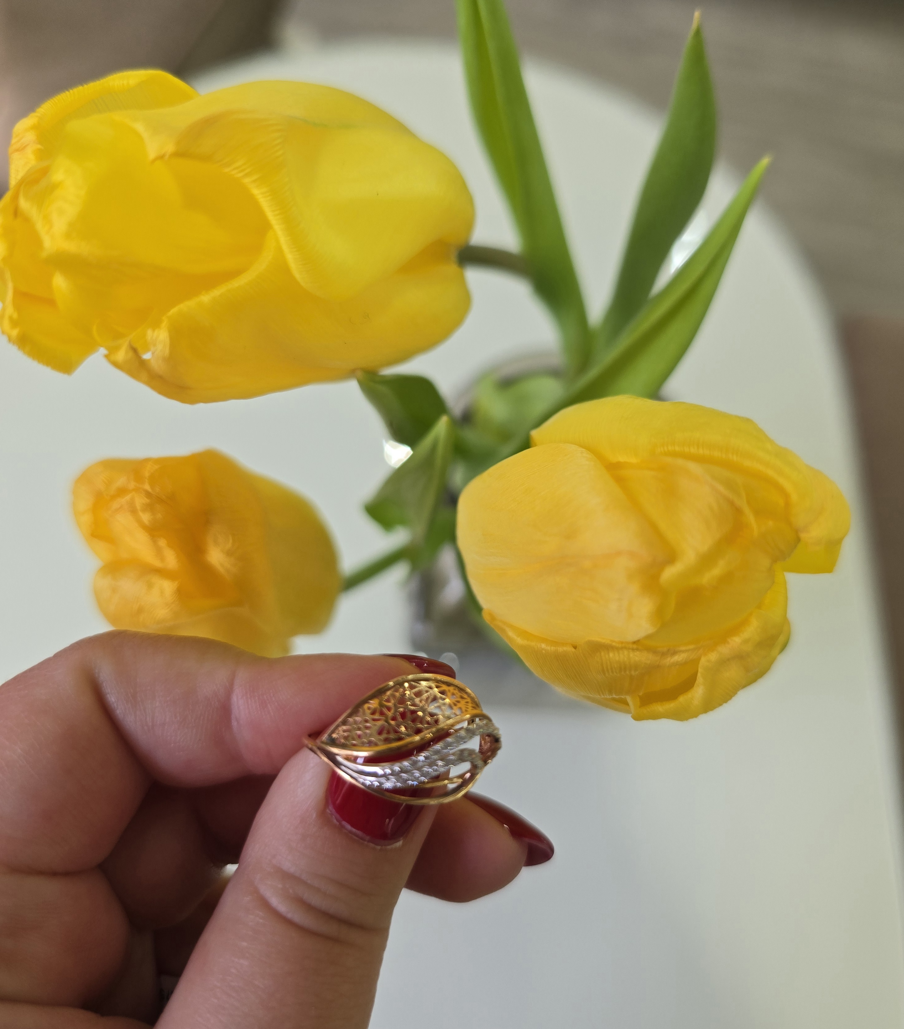 Выбрали с супругом вместе мне подарок к 8-марта. Очень изящное, но интересное кольцо в золоте 585 пробы. Нигде таких раньше не видела!