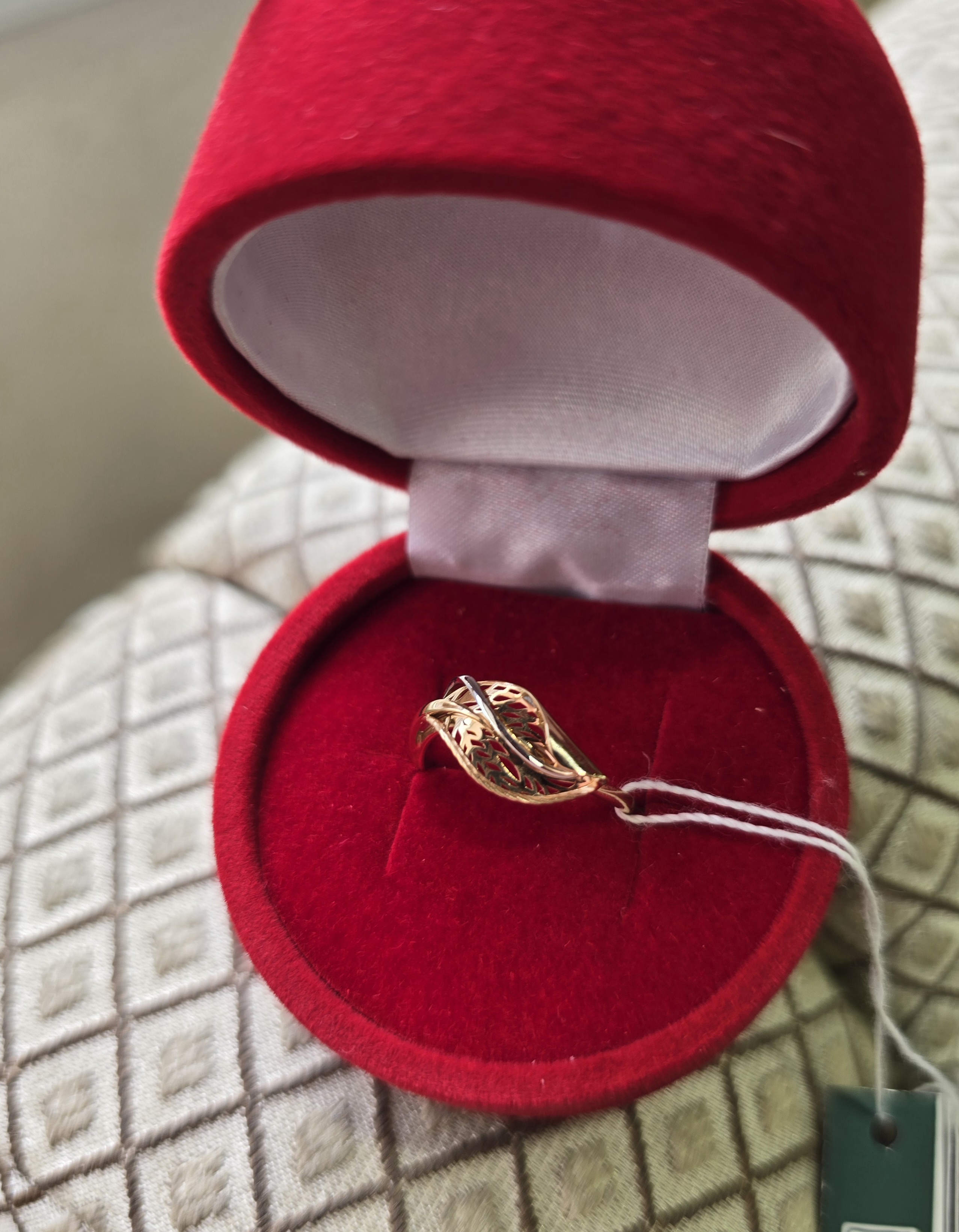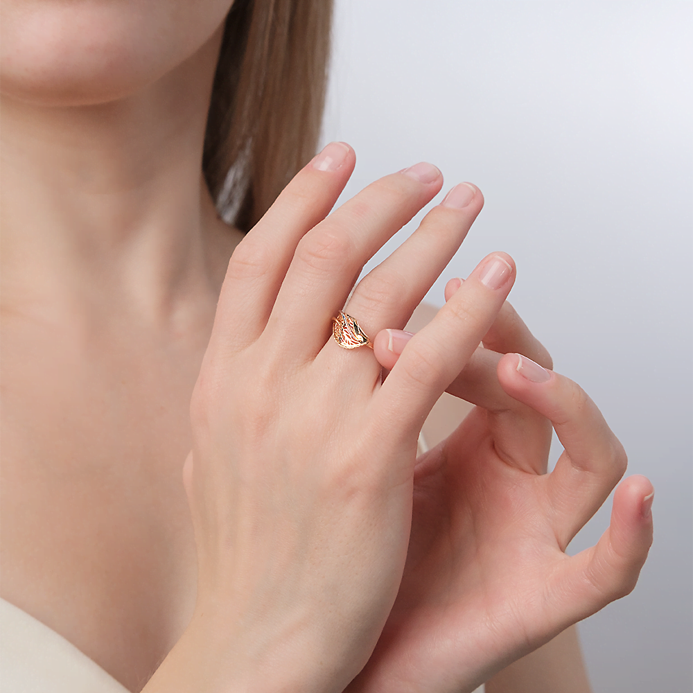 Кольцо выполнено из красного и белого золота 585 пробы