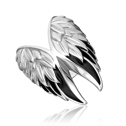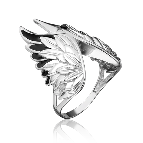 Фантазийное кольцо-крылья из серебра 925 пробы с ювелирной эмалью. Дизайн украшения в стиле модерн, анималистика. Декоративная часть изделия выполнена в виде пары крыльев, раскрашенных чёрной эмалью и отполированных до зеркального блеска (нанесение эмали и полировка выполнены вручную). Покрытие родием обеспечивает украшению дополнительный блеск и длительную сохранность внешнего вида. Кольцо подойдёт в качестве коктейльного, в неформальный гардероб, для повседневного ношения. Изделие представлено брендом PLATINA. В комплект поставки входит: