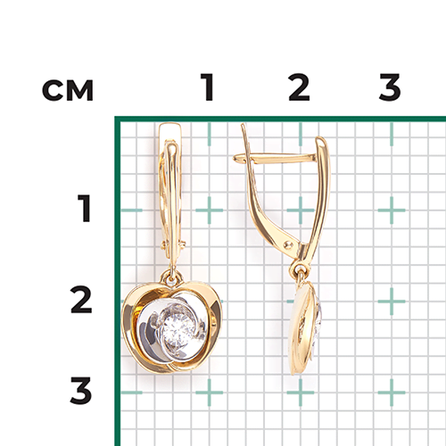 Серьги с подвеской, украшенной фианитом на изящном многослойном касте в виде яблока, выполнены из белого и жёлтого золота 585 пробы