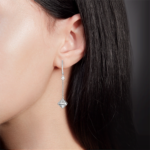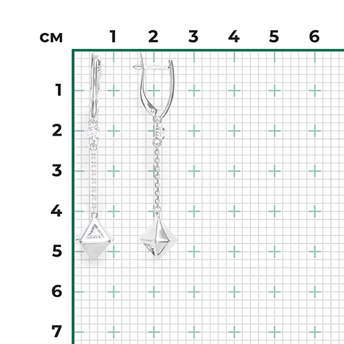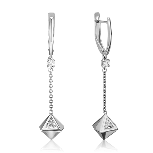 Подвесные серьги с английским замком с цепочкой из белого золота 585 пробы с фианитом. Дизайн изделий – геометрия. Декоративный элемент серьги – подвес в виде скруглённого октаэдра, украшенный камнем треугольной огранки. Крепится к швензе на цепи якорного плетения, дополненной миниатюрной вставкой в крапановой оправе. Динамичный силуэт серёг подойдёт как для вечернего, так и для коктейльного или неформального гардероба, и даже для повседневного ношения.Изделие представлено брендом PLATINA. Вставки: 10 Фианит. В комплект поставки входит: