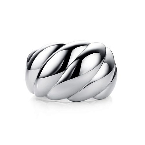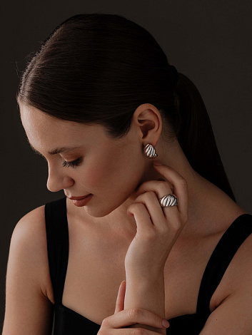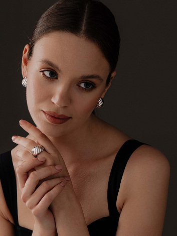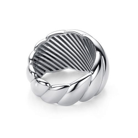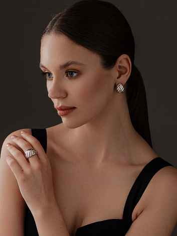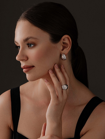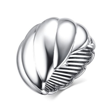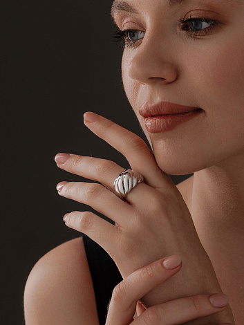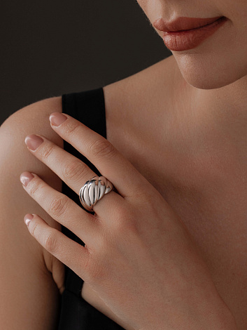Объёмное кольцо с оригинальным рельефным дизайном выполнено из родированного серебра 925 пробы