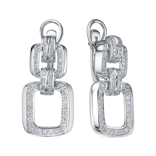 Роскошные серьги из белого золота 585 пробы с бриллиантами. Россыпь камней придает серьгам одновременно изящность и воздушный объем. Тип замка - английский, самый надежный и удобный. Модель лаконичная, с очень комфортной посадкой на ухо, за счет расположения замковой части ниже, чем декоративной части серьги.Средние характеристики вставки: 44 Бр Кр 57 1,20-1,25 120-200 4/6А - 0,352 ct.; 96 Бр Кр 17 0,75-0,80 200-400 2/3А - 0,192 ct. Изделие представлено брендом ROSE GRACE В комплект поставки входит:
