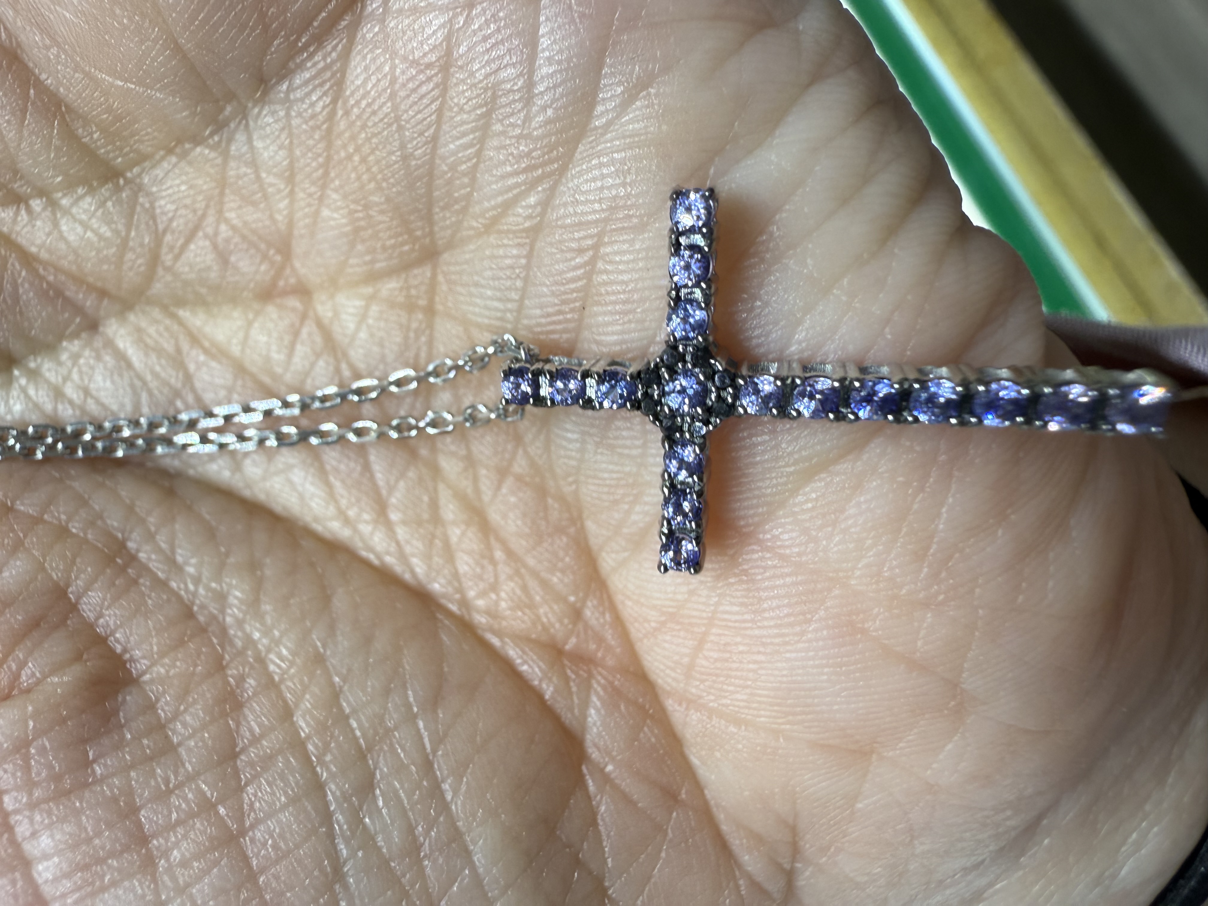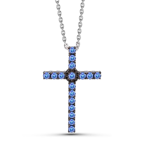 Роскошное колье с подвесом в виде креста, украшенного искрящимися бриллиантами и сапфирами, выполнено из белого золота 585 пробы