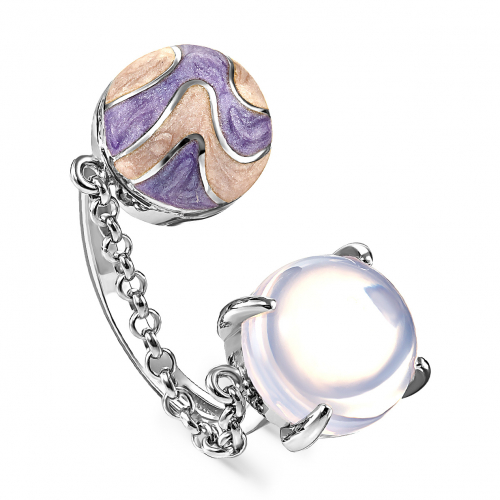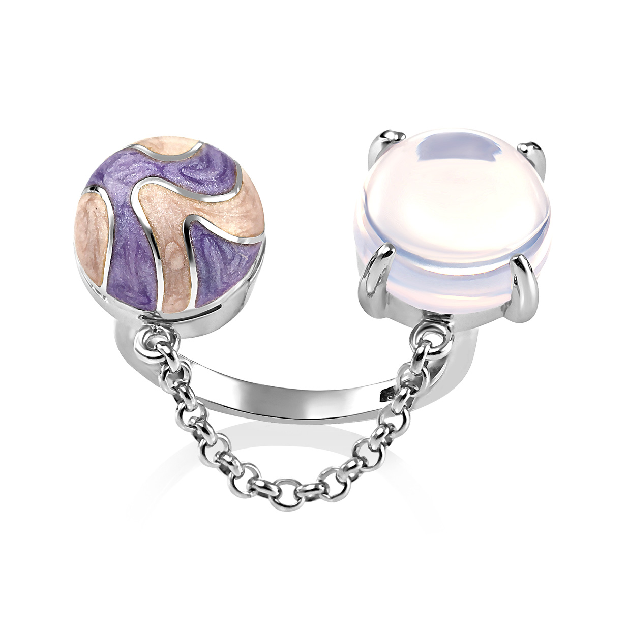 Оригинальное кольцо с цепочкой, выполнено из серебра 925 пробы с родиевым покрытием, которое делает серебро устойчивым к повреждениям, не вызывает аллергии, не темнеет и дарит искрящийся блеск. Украшено кольцо холодной эмалью и белым алпанитом.