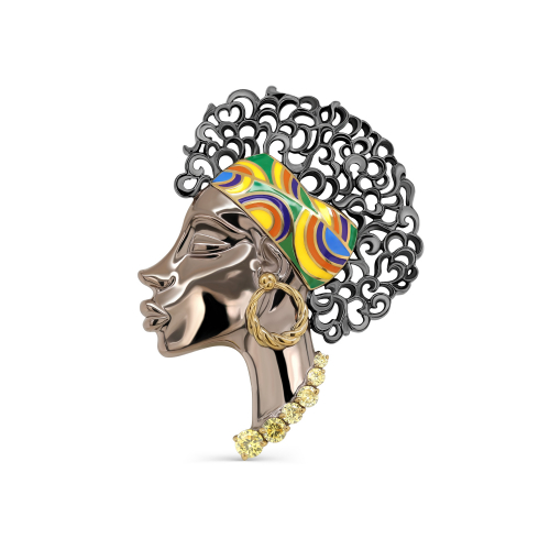 Роскошная брошь из коллекции "СОКРОВИЩА БÁНТУ" выполнена из серебра 925 пробы, украшена холодной эмалью и россыпью цветных фианитов
