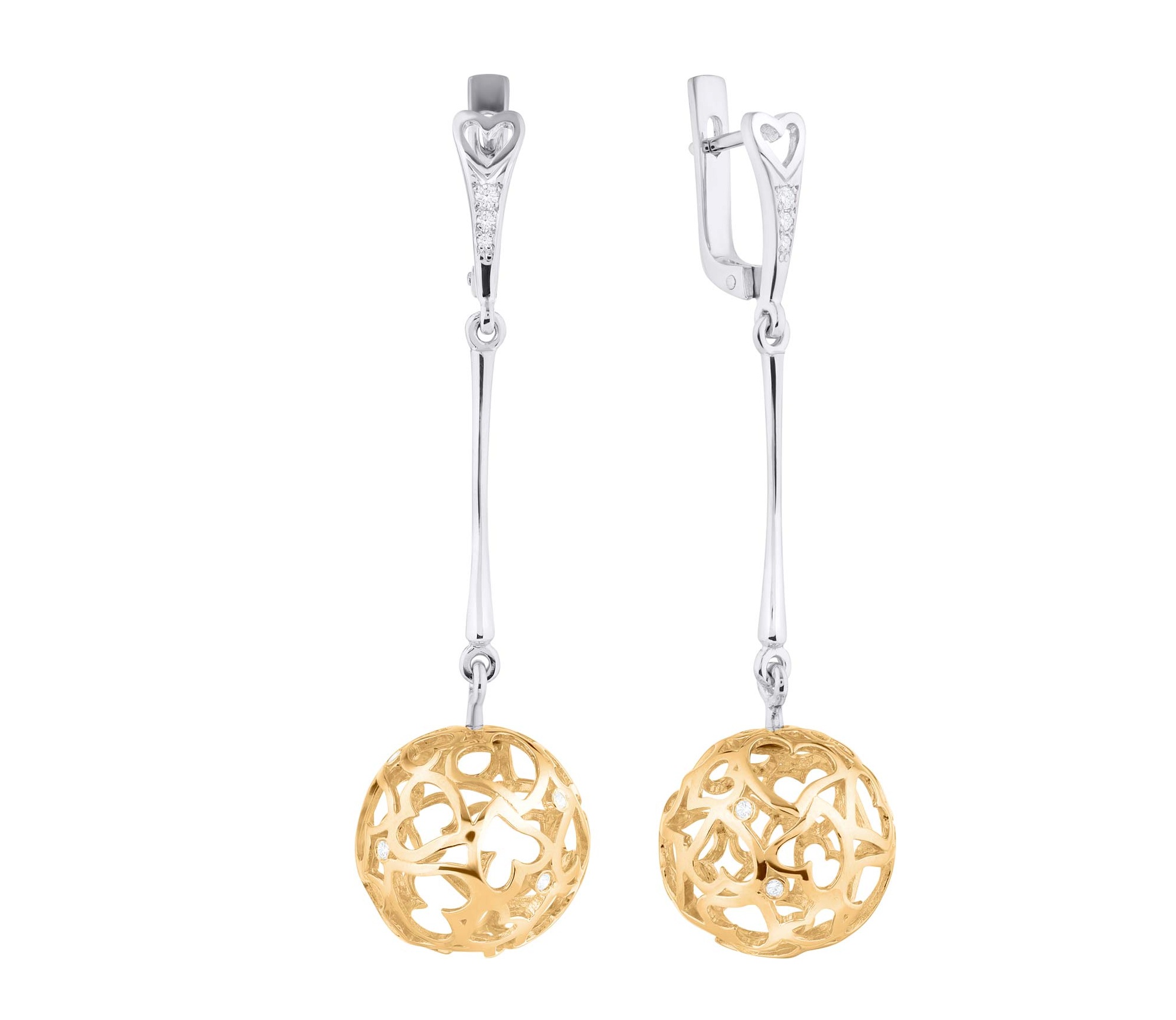 Стильные удлинённые серьги с ажурными подвесками, из серии "Для любимой" от бренда АЛЬДZЕНА, выполнены с сочетанием жёлтого и белого золота 585 пробы, украшены бриллиантами