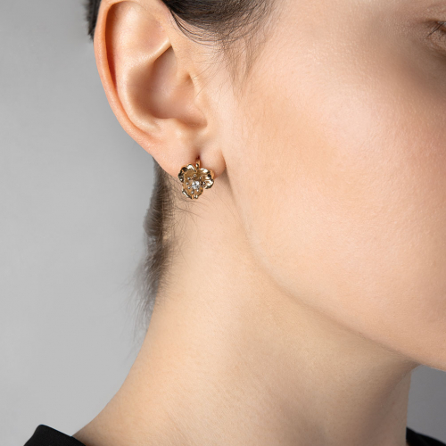 Чарующие серьги, выполненные в форме изящного распустившегося цветка, изготовлены из нежного желтого золота 585 пробы и дополнены искрящимися бриллиантами