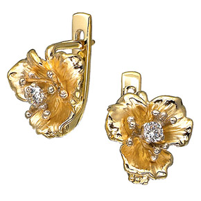 Чарующие серьги, выполненные в форме изящного распустившегося цветка, изготовлены из нежного желтого золота 585 пробы и дополнены искрящимися бриллиантами. Украшение оснащено надежным и удобным английским замком.