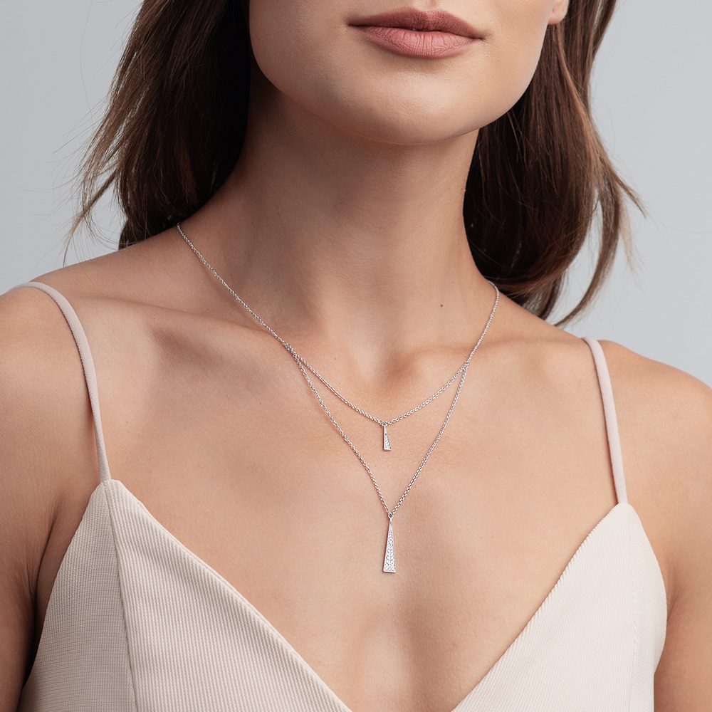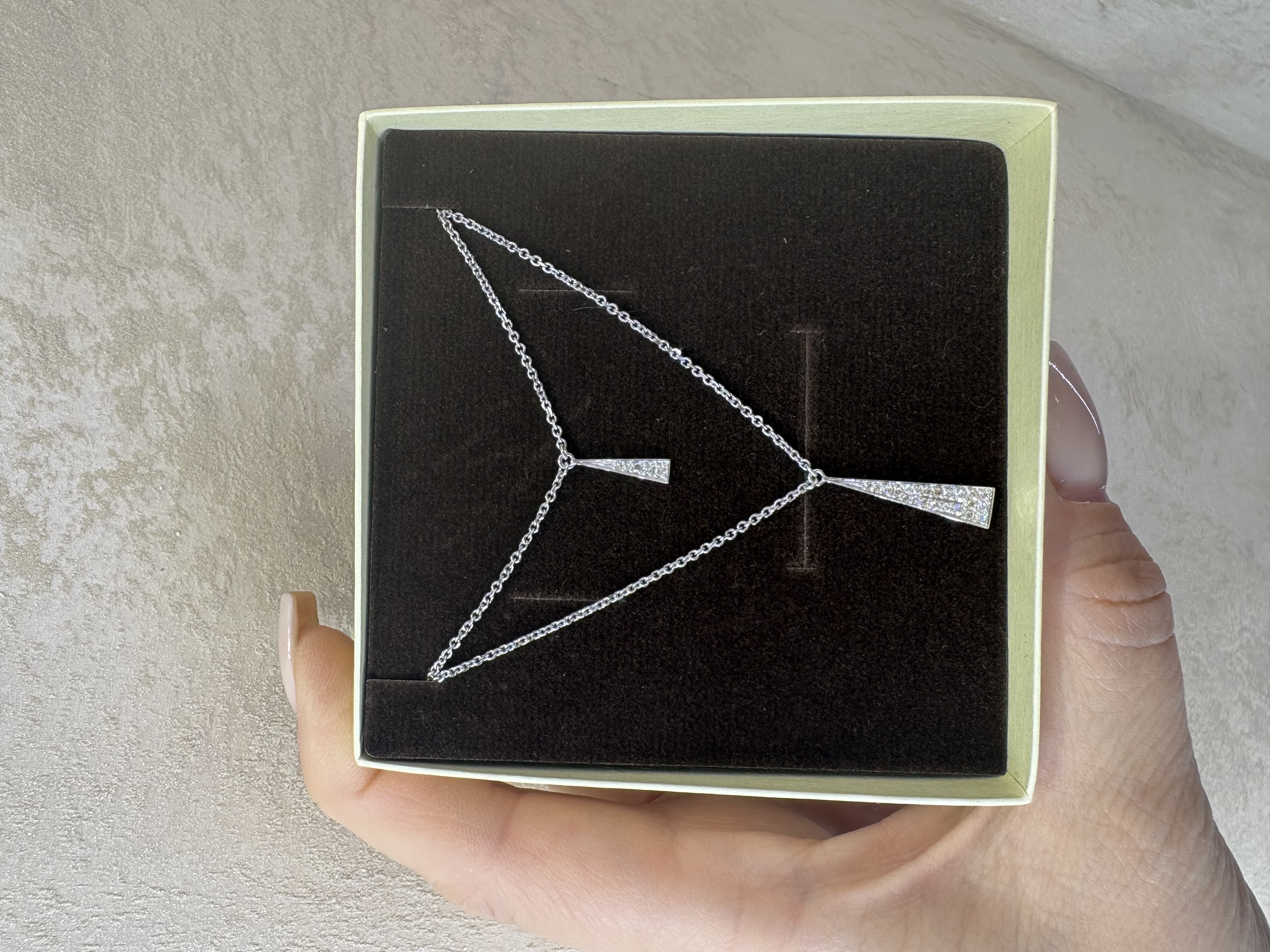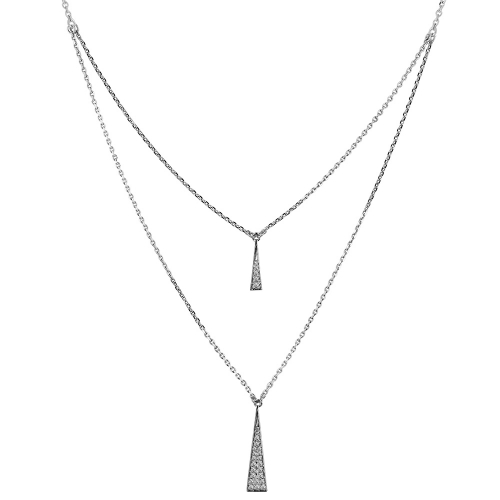Стильное многослойное цепочное колье с подвесной частью в геометрическом стиле, украшенной сверкающими бриллиантами, выполнено из белого золота 585 пробы