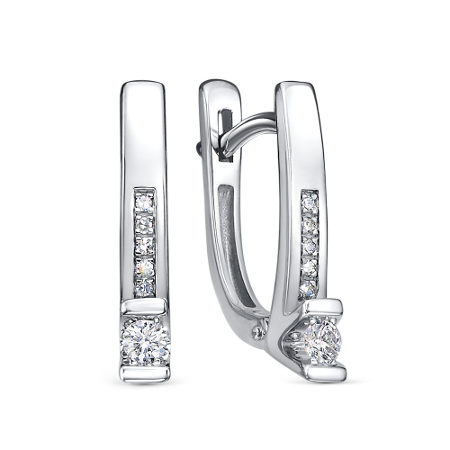 Серьги с сверкающим бриллиантом в центре, блеск и красоту которого подчёркивают и усиливают бриллианты меньшего размера, выполнены из белого золота 585 пробы
