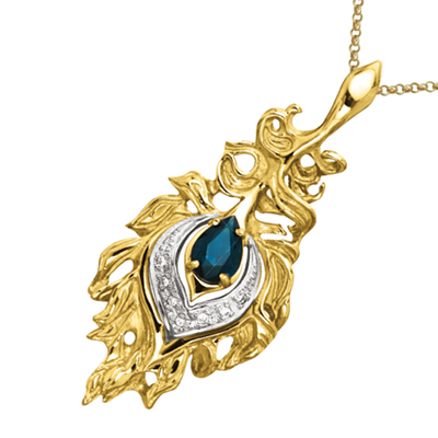 Роскошная объемная подвеска выполнена в сочетании белого и желтого золота 585 пробы, инкрустирована сапфиром и бриллиантами