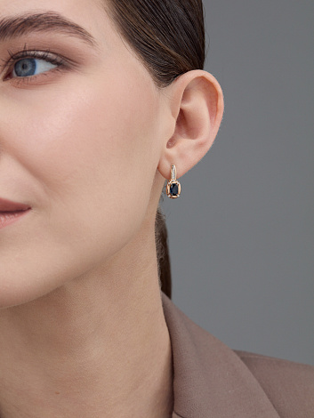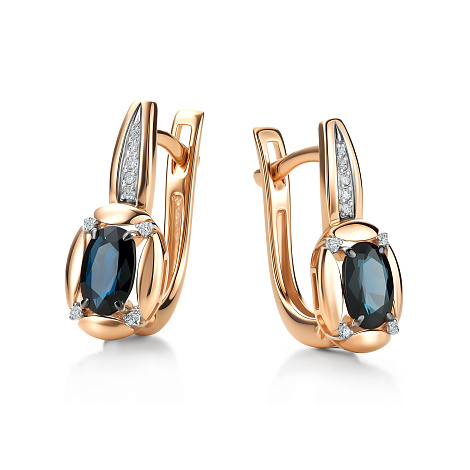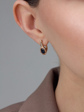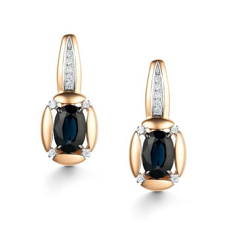 Серьги выполнены из красного золота 585 пробы, украшены темно-синими сапфирами в окружении сияющих бриллиантов