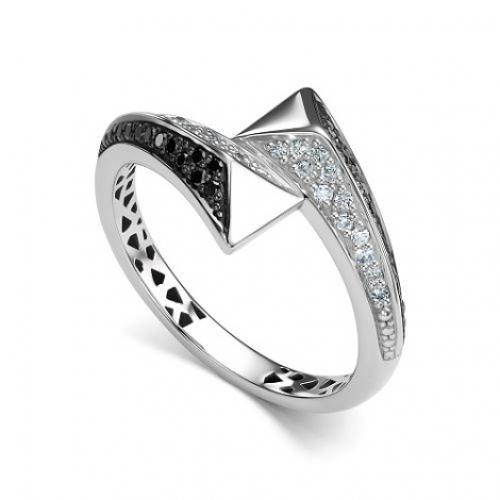 Нежное кольцо, украшенное чёрными и бесцветными сверкающими бриллиантами, выполнено из белого золота 585 пробы