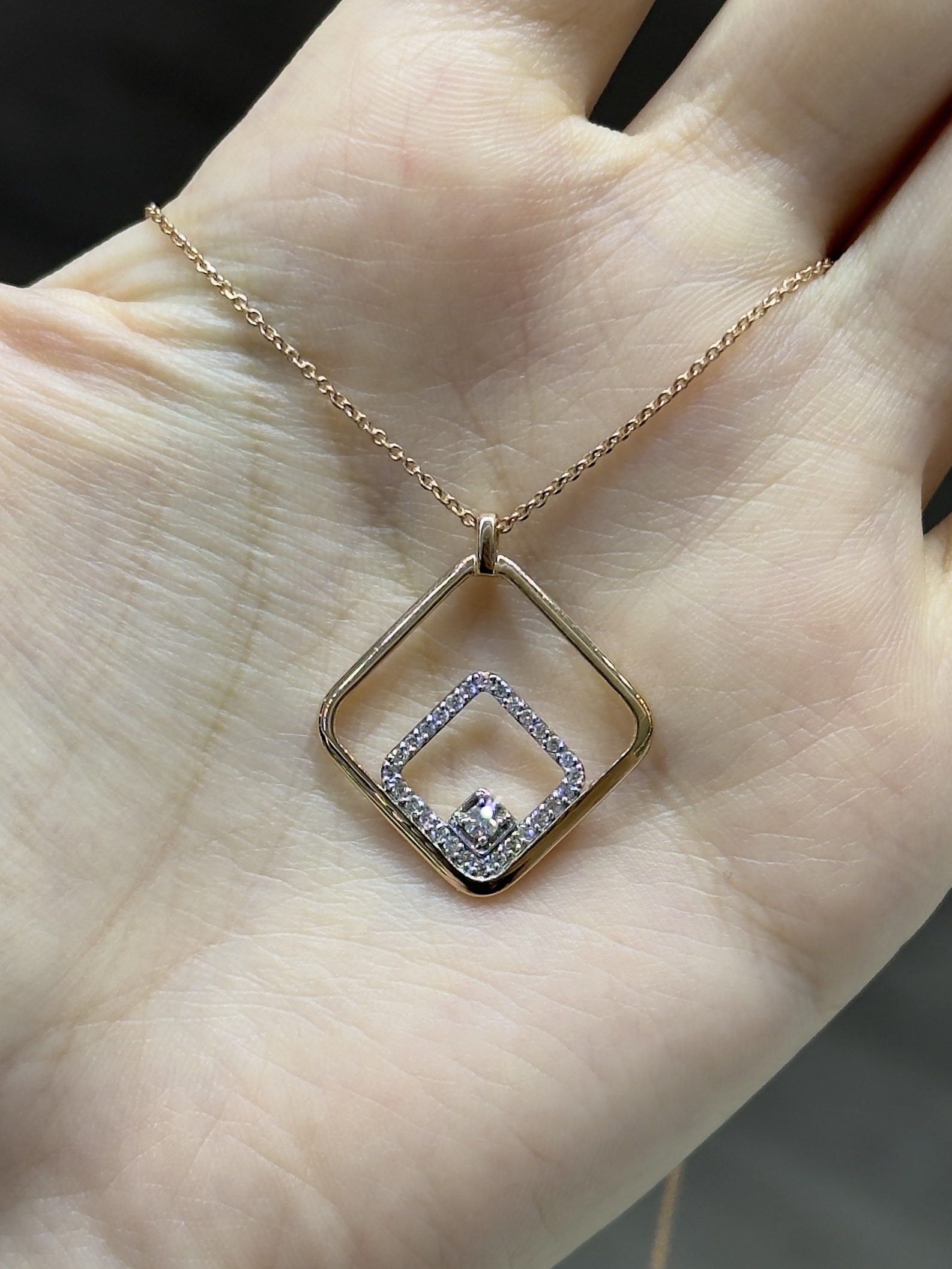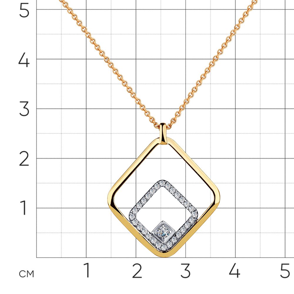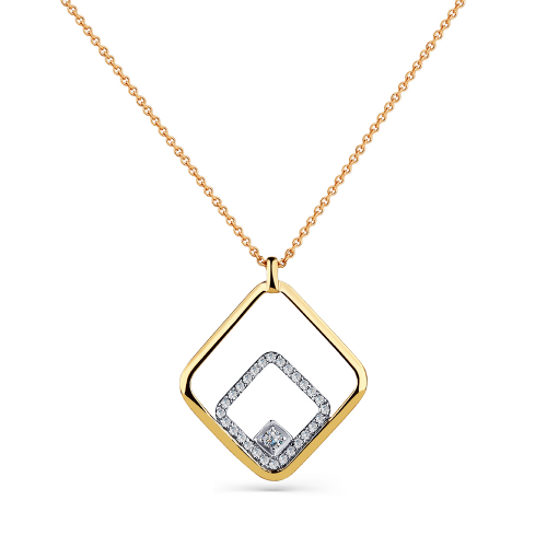 Стильное цепочное колье с подвесной частью в геометрическом стиле, украшено сверкающими бриллиантами, из белого золота 585 пробы