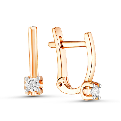 Классические серьги из коллекции Eleganzza из красного золота 585 пробы, украшены великолепным сияющим бриллиантом . Оригинальная закрепка драгоценных камней позволяет лучам света играть на их поверхности, делая ещё более искристыми и привлекательными. Такое украшение станет модной изюминкой в повседневном или деловом образе. Тип замка - английский, самый надежный и удобный. Изделие представлено брендом PRIMO PREZIOSO. К украшению прилагается сертификат от производителя о подлинности драгоценных камней. Средняя характеристика камней на артикул: 2 Бриллиант Кр 57 (15-10) 0,156Ct 4/6А В комплект поставки входит: