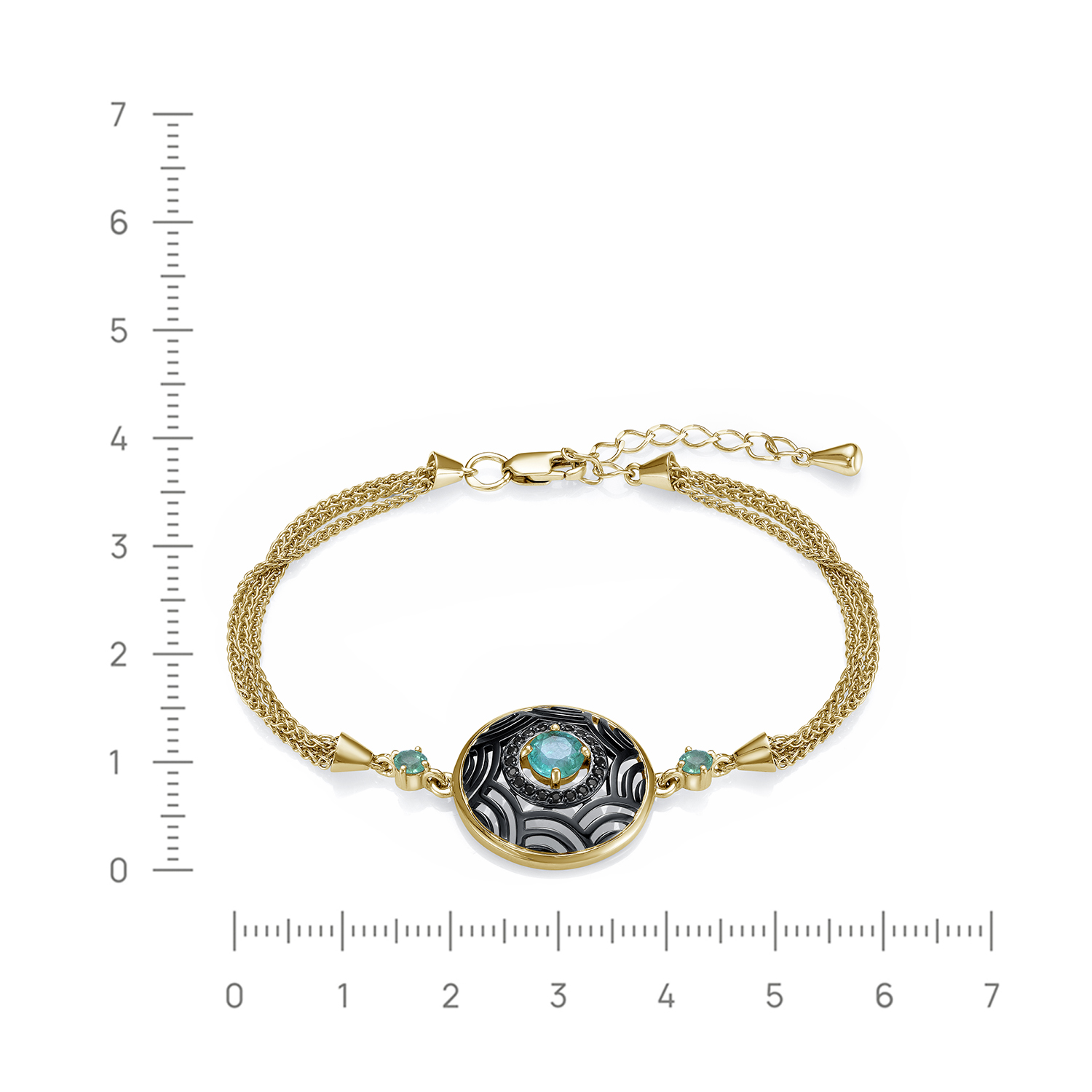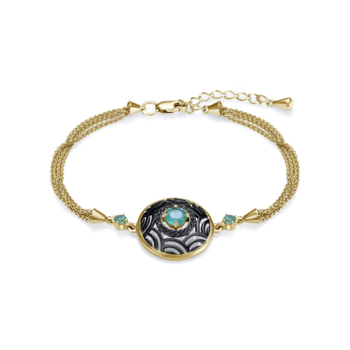 Великолепный браслет из серебра 925 пробы, с применением технологии золочения и родирования, украшены натуральными изумрудами и черными фианитами. Браслет входит в коллекцию " Сокровища Ацтеков" от бренда Kabarovsky. Такое украшение не оставит вас незаметной и дополнит ваш образ. Средняя характеристика камней: 20 Фианит Круг 1,00|2 Изумруд Круг 3,00 3/3 0.183ct|1 Изумруд Круг 5,00 3/3 0.461ct В комплект поставки входит: