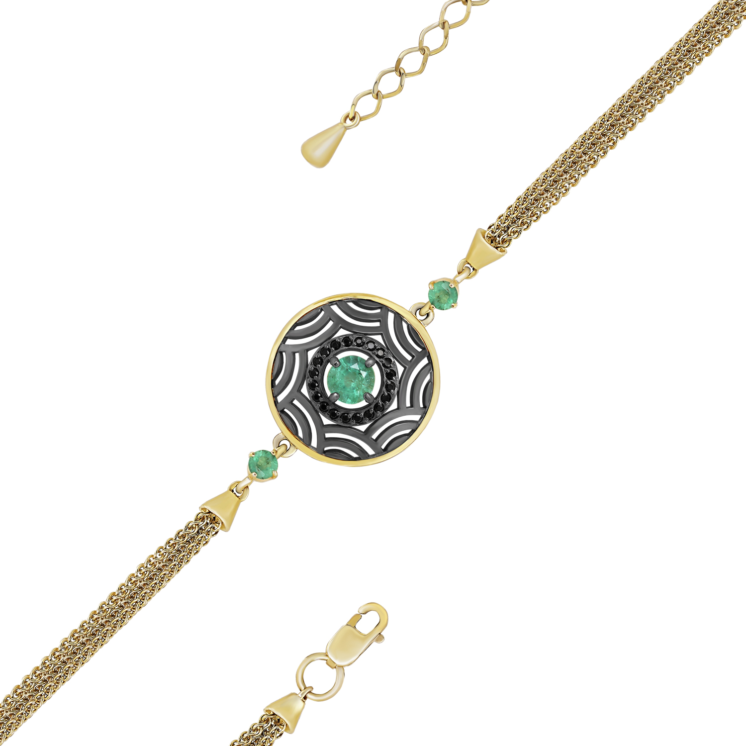 Великолепный браслет из серебра 925 пробы, с применением технологии золочения и родирования, украшены натуральными изумрудами и черными фианитами