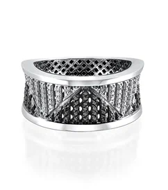 Роскошное объёмное кольцо, украшенное сверкающими чёрными и бесцветными бриллиантвми, выполнено из белого золота 585 пробы