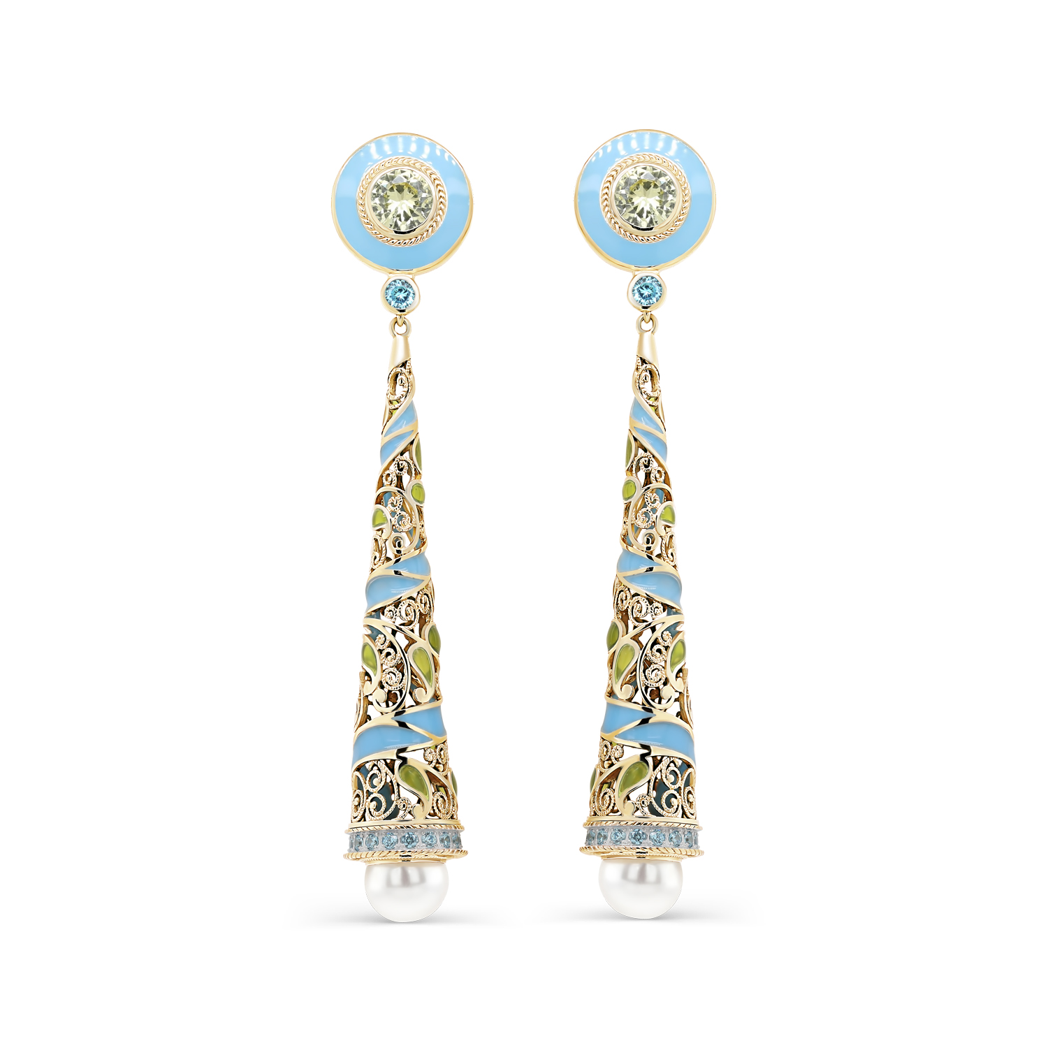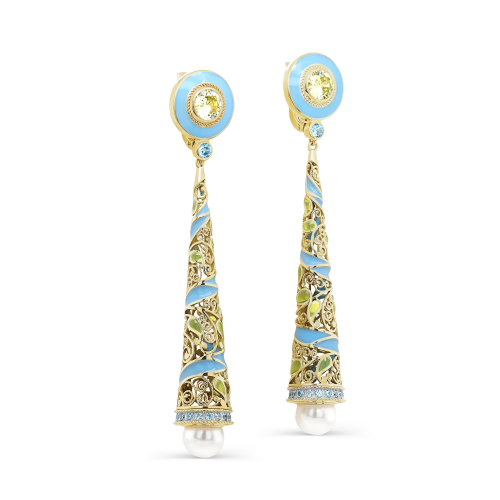 Оригинальные яркие длинные серьги выполнены из серебра 925 пробы с золочением. Серьги украшены холодной эмалью, белыми жемчужинами и сияющими фианитами.