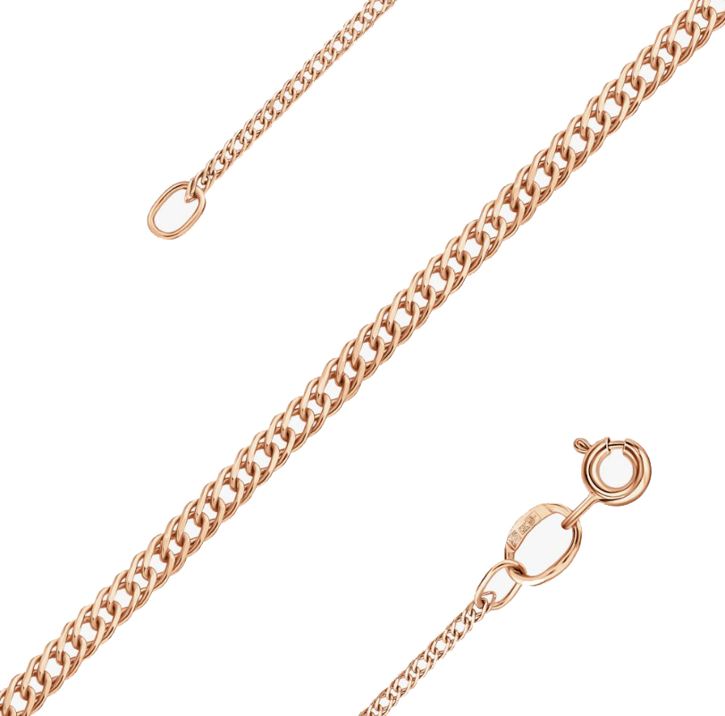 Полновесная цепь из насыщенного красного золота 585 пробы притягивает взгляд изысканным плетением «двойной ромб», которое подчеркивает блеск благодаря оригинальной алмазной грани