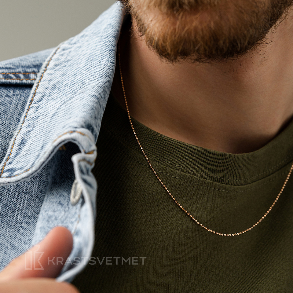 Цепь из тёплого красного золота 585 пробы с жемчужным плетением «Шарики» и выразительной отделкой алмазной гранью. Изюминка изделия — небольшие сферические звенья, созданные с использованием специального способа обработки, придающего каждому звену искрящийся блеск, подобный драгоценным камням. Внешне цепочка выглядит лёгкой и воздушной, однако её прочность не оставляет сомнений. Это украшение подойдёт тем, кто хочет добавить к своему образу элемент фешенебельной элегантности и притяжения взглядов. Диаметр проволки 1,50 мм. Представлено брендом КРАСЦВЕТМЕТ. В комплект поставки входит: