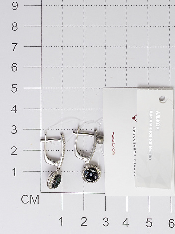 Нежные удлинённые серьги с подвеской круглой формы украшенной сапфирами и бриллиантами, выполнены из белого золота 585 пробы