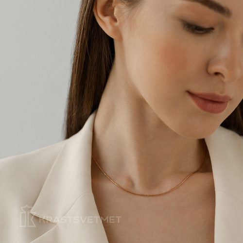 Полновесная цепь из красного золота 585 пробы с изысканным плетением «Снейк» и стильной обработкой алмазной гранью. Технологическая обработка алмазной грани добавляет изделию особого блеска и подчеркнуто делает его выразительным и манящим. Женственная, легкая и невероятно удобная, эта цепь стала любимой моделью у представительниц прекрасного пола, подчеркивающих свою женственность и чувственность. Диаметр проволки 0,35 мм. Предсталвено брендом КРАСЦВЕТМЕТ. В комплект поставки входит: